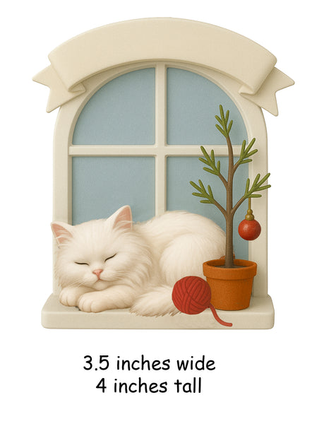 Celebrate the cozy charm of the holiday season with this delightful White Persian Cat Ornament. Featuring a handpainted white Persian cat peacefully resting by a window, this ornament captures a moment of serene warmth and comfort. Accented with a small potted evergreen and a bright red ball of yarn, the scene evokes memories of family and quiet winter days at home.